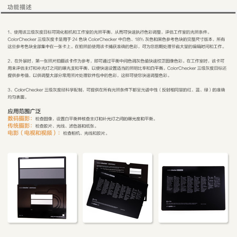 产品类别:可快速实现色彩平衡,简化工作室光照平衡。包含白色、18%中灰和黑色的三阶灰度卡。