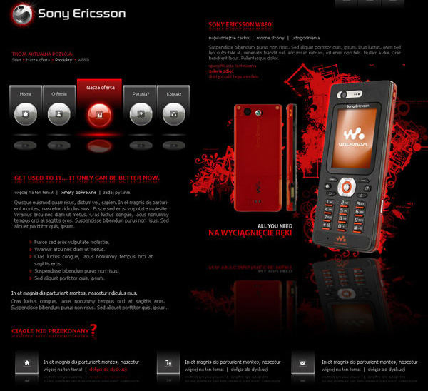 赤色+黑色谐和,一种金属冷色+火热的赤色的比照配色,运用黑白灰的金属颜色来体现出科技感,又用火热奔放的赤色来表现出音乐手机的商品定义。