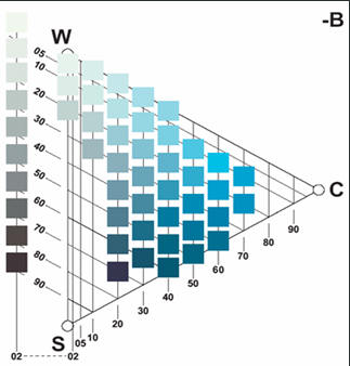NCS颜色立体的垂直剖面图的左右半侧各是一个三角形,如图所示: