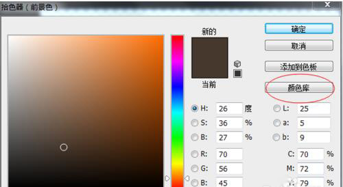 1、打开PS,调出拾色器,选中“颜色库”。如下图所示: