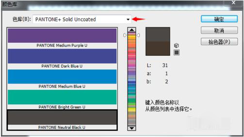 2、就会弹出对应的颜色库面板;可以在下拉菜单中选中你所需要的潘通色卡系列。点击你所需要的颜色即可。如下图所示: