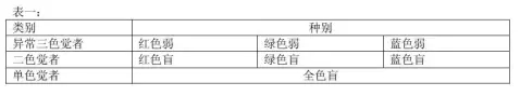 色盲和色弱统称为色觉障碍,分为先天性和后天性两大类,色盲是不能辨别某些颜色或全部颜色,色弱则是指辨别颜色的能力降低。先天性色觉障碍的原因在于视色素的光化学不正常。根据对颜色的匹配情况色觉异常可分为:异常三色觉者、二色觉者、单色觉者(全色盲)表一: