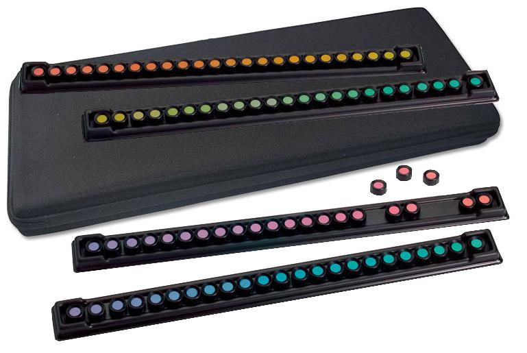 FM100-Huetest 色觉测试 FM100-Huetest 色觉测试是一种检查辨色能力的简单有效的方法;本套色觉测试分为两个部分:FM100 色棋( Farnsworth Munsell 100 Hue Test) 和 FM100 评分系统(Farnsworth Munsell 100 Hue FM100-Huetest)色觉测试是1943 年由 Farnsworth 根据呈色原理,选用标准孟塞尔(Munsell)色样设计而成。目前已被各种与色彩打交道的行业广泛应用;