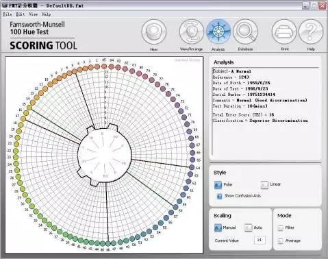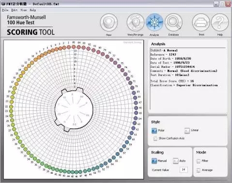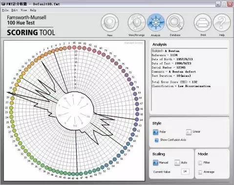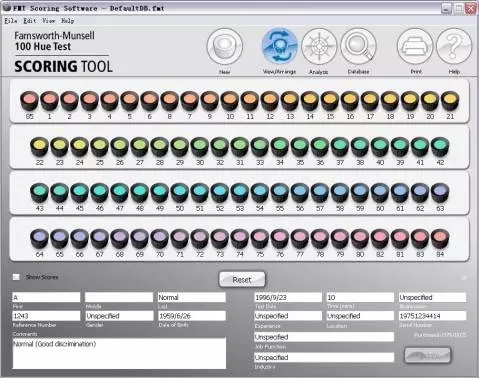 7. 评分:a.打开软件FM100Hue.exe;b 盖上每个塑料盒子的透明盖子,再倒向打开盒子,按照棋子的实际顺序,在评分软件中,调整软件中棋子的顺序;依次完成4 盒棋子的顺序记录;c 填写被测试人姓名,年龄,工作年限,测试时间,职业类型,批注等点击保存(save);然后点击“分析”(Analysis)则右侧可以看到其错误分数;