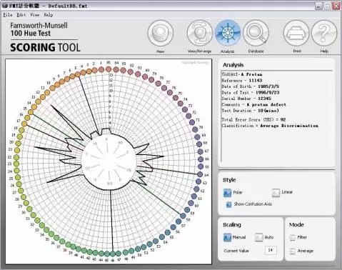 “色盲 Color Blindness”实际指对一类有序色列的平衡失调,也就是对某序列颜色辨别不如其他序列颜色准确;体检中,最常见的就是通过识别色盲图(比如石原氏色盲检查图)来检测色盲和色弱,色盲图可用于检测颜色平衡失调,但是它不能检测辨色的能力;而FM100 孟塞尔色觉测试则可以指出测试者颜色平衡失调的类型,并指出其最好的和最差的色觉区域以及那些区域的辨色能力;
