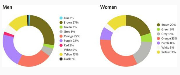 男性和女性都非常不喜欢棕色、橙色和黄色。灰色是女性最不喜欢的色彩之一,而紫色是男性最不喜欢的色彩之一。