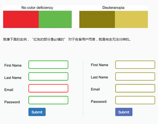 同样的色彩,不同的人所看到的是不一样的。大约有8%的男性和0.5%的女性是色盲,而色弱的用户也不在少数。红绿色盲是最常见也是占比最多的视觉障碍者,所以,在做产品配色方案时,需要尽量避免将这两种色彩搭配到一起,至少不要用作关键的信息用色,这样能规避不少问题。
