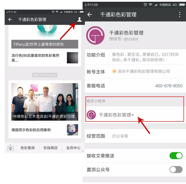 方法二:关注深圳千通彩微信公众号“qtccolor”,在千通彩公众号的关注页,点右上角头像即可看到入口;
