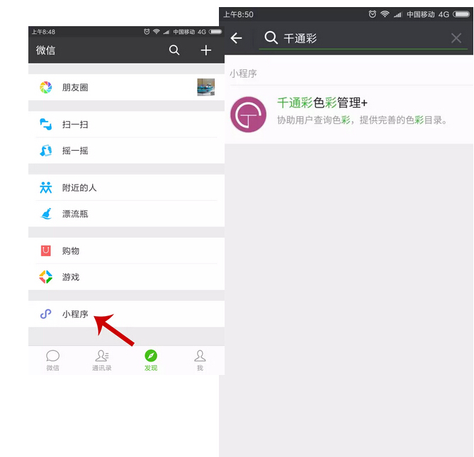 方法三:在微信客户端“发现”里找到“小程序”,点进去搜索“千通彩”或“色彩”即可进入小程序页面;