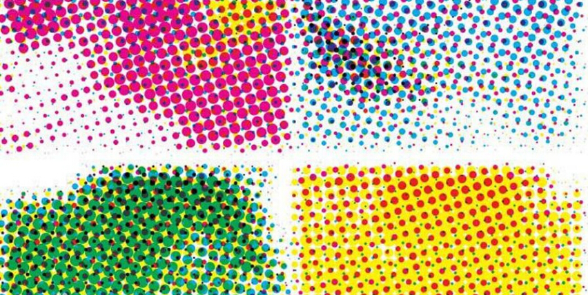CMYK也称作印刷色彩模式,是一种专门针对印刷设定的颜色标准,是通过对青(C)、洋红(M)、黄(Y)、黑(K)四个颜色变化以及它们相互之间的叠加来得到各种颜色的,CMYK即是代表青、洋红、黄、黑四种印刷专用的油墨颜色,也是PS软件中四色通道的颜色。它在四色印刷、四色打印等方面尤为突出。虽说CMYK色彩不如RGB色丰富饱满,在PS中运行速度会比RGB色慢,由于颜色种数没有RGB色多,当图像由RGB色转为CMYK色后颜色会有部分损失(从CMYK转到RGB则没有损失),但它却是唯一一种能用来进行四色分色印刷的颜色标准。放大看CMYK四色印刷都是有无数个四种颜色的墨点组成,我们来看下: