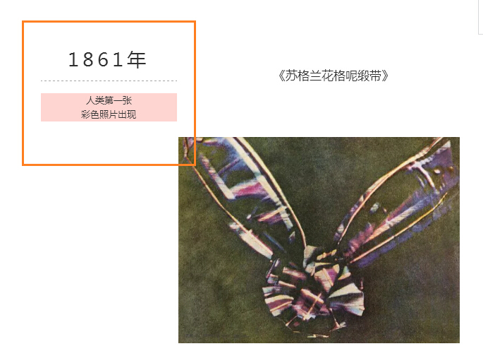 1861年,萨顿对着这条缎带拍摄了三幅同样的照片,用三部放映机同时将映像透射到银幕上,每部放映机镜头前都拧上不同颜色的滤镜。同伴麦克斯韦尔当时提出了用三原色可以混合出世间的任意一种颜色,他的这个论断在这次放映试验上得到了验证——人类第一张彩色照片就这样诞生了---《苏格兰花格呢缎带》。