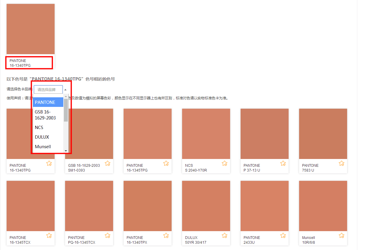 想通过pantone 16-1340 TPG色号查找相近色彩,得出的相近色彩号还能与色卡品牌一一对应,千通彩色库是设计师与生产商找色彩的福音,使用简单方便又快捷。