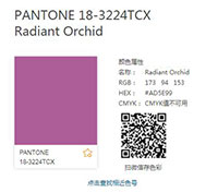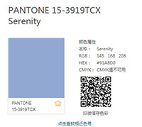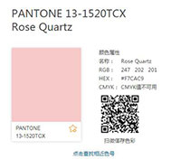 | 2016年度色 蔷薇粉(Rose Quartz 潘通色号:13-1520) 静谧蓝(Serenity 潘通色号:15-3919) | 2017年度色 草木绿(Greenery 潘通色号:15-0343) | 2018年度色 紫外光色(Ultra Violet 潘通色号:18-3838) | |