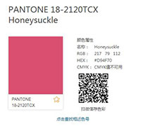 | 2012年度色 探戈橙(Tangerine Tango 潘通色号:17-1463) | 2013年度色 翡翠绿(Emerald 潘通色号:17-5641) | 2014年度色 兰花紫(Radiant Orchid 潘通色号:18-3224) | 2015年度色 玛萨拉酒红(Marsala 潘通色号:18-1438) |