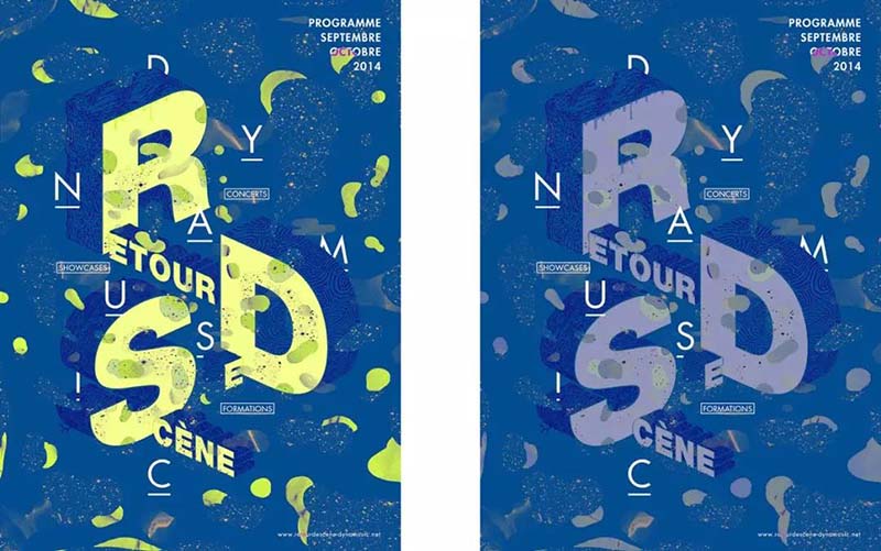 这个海报的主角很明显就是立体的英文,而这里正是通过较大的色相差来衬托主角的,浅绿色的文字在蓝色的背景上十分明显。如果主角的颜色换成与背景差异不大的色相就没那么突出了。