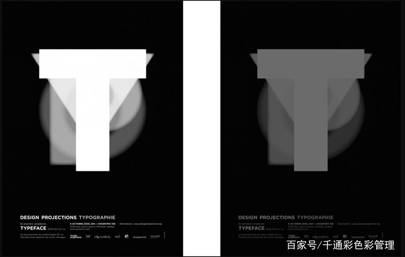 海报的配色使用的都是无彩色,整个画面由黑白灰组成,从颜色上来看主角已经很明确了就是版面中心的白色字母,黑色和白色的明度差是最大的,所以黑底白字当然也就非常显眼了。而如果将白色降低明度变成灰色虽然也能分辨出主角,但是整体却变的模糊甚至带有脏兮兮的感觉。