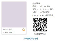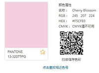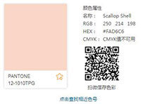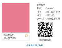 ![]() | PANTONE色号:18-1662TCX (Flame Scarlet) | PANTONE色号:13-3802TPX (Orchid Tint) | PANTONE色号:12-1010TPG (Scallop Shell) |