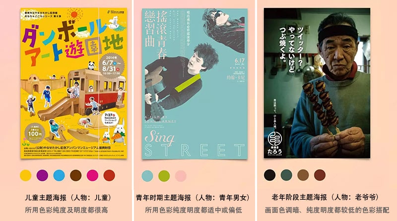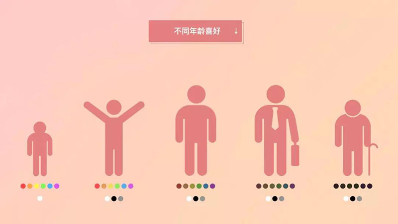 二、不同的年龄喜好:根据不同年龄喜好选择配色方案。从年龄上大致可分成五个阶段:儿童阶段、少年阶段、青年阶段、中年阶段、老年阶段。不同年龄层的喜好在色相上并不好划分,但是从纯度和明度的角度来看还是有一些规律的。