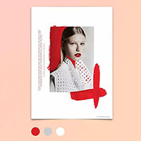 案例2:图中海报的主体人物依然是女性,设计中使用了红色和灰色,这次的配色原则是近似色搭配,配色灵感来源于主体人物的唇彩颜色,嘴上涂抹的红色为整个画面奠定了基础色,和主体人物身上的红色相呼应,并且文字色也是红色,大面积的留白背景又让整个版面显得干净有格调,这些都符合女性的色彩定位。