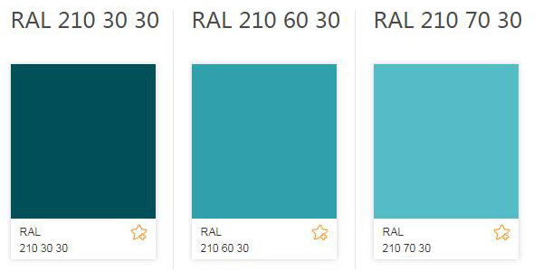 以1976发布的国际通用的CIELab的色彩空间为基础,德国劳尔RAL专为色彩设计而开发的配色系统,是以一个有规律次序排列的1825种颜色,所有这些7个数字的色彩明暗被划分为单独的RAL颜色。这和RAL古典颜色标本之间的不同是RAL设计系统的颜色代码不是任意排列的。它们显示了色度、明亮度及色彩之强度的工业技术测量值。例如:RAL 210 30 30是一个色度210、亮度30、色彩强度为30的颜色色调。如果你希望将这个颜色色调同一个更亮的色调结合,你可以选择RAL 210 60 30,从而你可以得到一个具有更高亮度60的颜色,此外你还可以选择色号为RAL 210 70 30,选出来的色彩将会更亮,如下图: