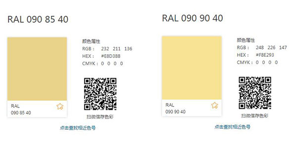 又如:新增色号中的RAL 090 85 40是一个比较暗一点的色彩,如果你想要一个比它更亮的色彩,你可以选择色号RAL 090 90 40的色彩;
