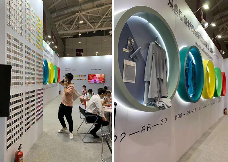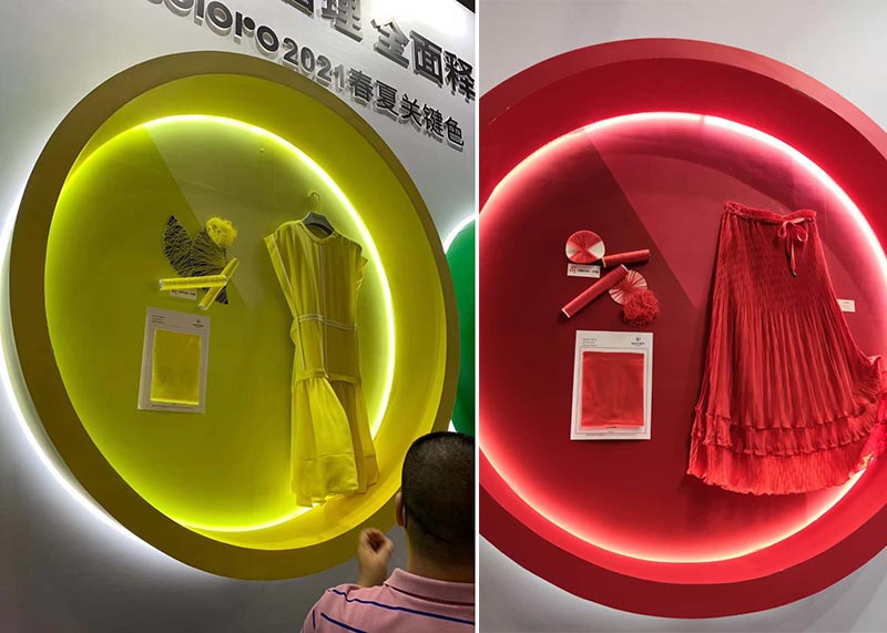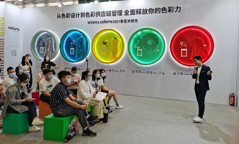 静谧绿的色彩灵感来自2021春夏,COLORO对于“静谧绿”的解读:绿色已经在多个季节中获得了成功,并且色相范围广泛。但对于2021春夏,绿色将朝着冷调方向演变。Quiet Wave的乐观主义和未来主义特质,使其成为下一个十年开始的完美情绪设定。它的灵感更偏向于科技,具有冷静、超脱的性格。另外展会上还呈现了COLORO vs WGSN联合推出的2021年春夏其他关键4大色系,分别是:火焰红、柠檬冰沙黄、智能蓝、沉静灰,展会现场布置中通过服饰及纱线呈现了这这几大关键色的应用效果。