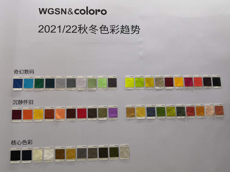 春去秋来,2021/22秋冬色彩趋势也是服装面料设计师及厂商非常关注的地方,在展会中,coloro同时向大家展示了未来一两年的秋冬色彩趋势将围绕几个主题展开,譬如:奇幻数码色彩,沉静怀旧色彩等,其中核心色彩中更多的是一些中性色彩,可满足各行各业的色彩需求。