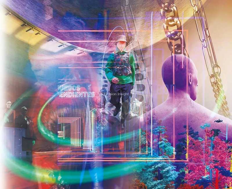 色彩对视觉和感官造成冲击。激发活跃思维的复古暖色调,渲染欢乐避世氛围,加强感染力,虚幻冷冽的光感色彩强调未来性与技术感融合的虚拟现实。色彩基调在浓烈与冷峻中调和,探索人与时尚未来的联系与思考;复古橙红色以幻蓝色点缀呈现科技复古外观,尽显强烈的超脱现实感,极具90年代狂欢气息;关注暗黑质感的亮彩色、数字亮色碰撞酸性强调色,呈现振奋不羁的电光感;红铜色与哑金色呈现技术光泽外观,活力十足的潮流色既能扫去暗沉的阴霾,也是对未来的憧憬和期盼。