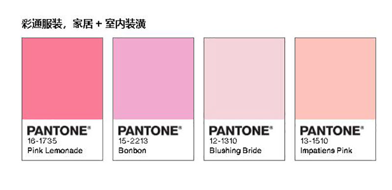 服装家居+室内装潢领域推荐粉色调色板色号有PANTONE 16-1735、15-2213、12-1310、13-1510;