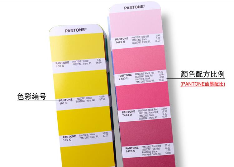 PANTONE配色指南中含有1867种PANTONE专色,分别以光面铜版纸和胶版纸印刷,扇形装订,为用户在选用、对比参照上提供了便捷的选择方式,所有色标的下方均标有PANTONE色名称(编号)及调配配比,所有色彩均由一套14种标准基本色墨及透明白调配而成。在接到客户的标准色样时,可以直接与PANTONE色卡配色指南对比,找出相对近似的色标,然后根据实际色差情况判定色相,找出引起色差的主要原因,再按判定的结果来调配油墨,方便实用。
