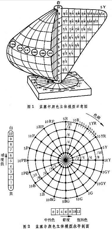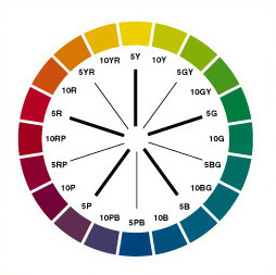 色调分为五种基本的颜色:红色(R)、黄色(Y)、绿色(G)、蓝色(B),和紫色(P),在每一种颜色的范围中可分为十种等级。 数值是定义于从白色到黑色的十一个步骤,而色彩浓度是分为十五个等级。 一个单色是由根据颜色准则瞄述(色调数值/发光度)。 比如: 5R 4/14。