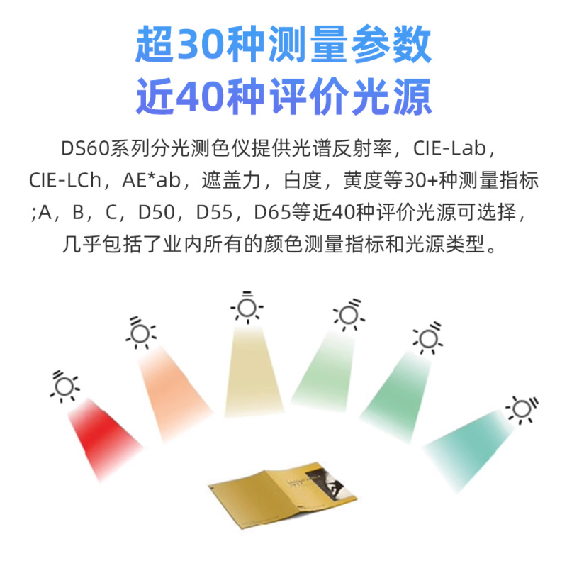 色差仪高精度DS62卧式分光测色仪便携式色差测试仪 卧式分光测色仪, 超高重复性精度:dE*ab≤0.02;卧式按压测量,物理定位观察窗;超过30种色度指标和40种评价光源