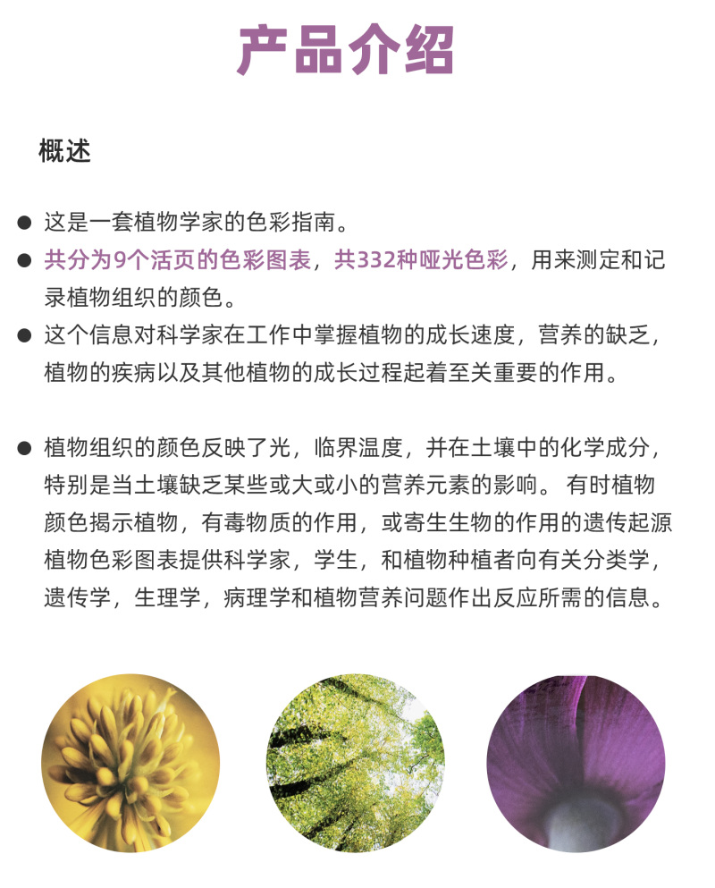 共分为十七个活页的色彩图表,共332种哑光色彩,通常被用来测定和记录植物组织的颜色。