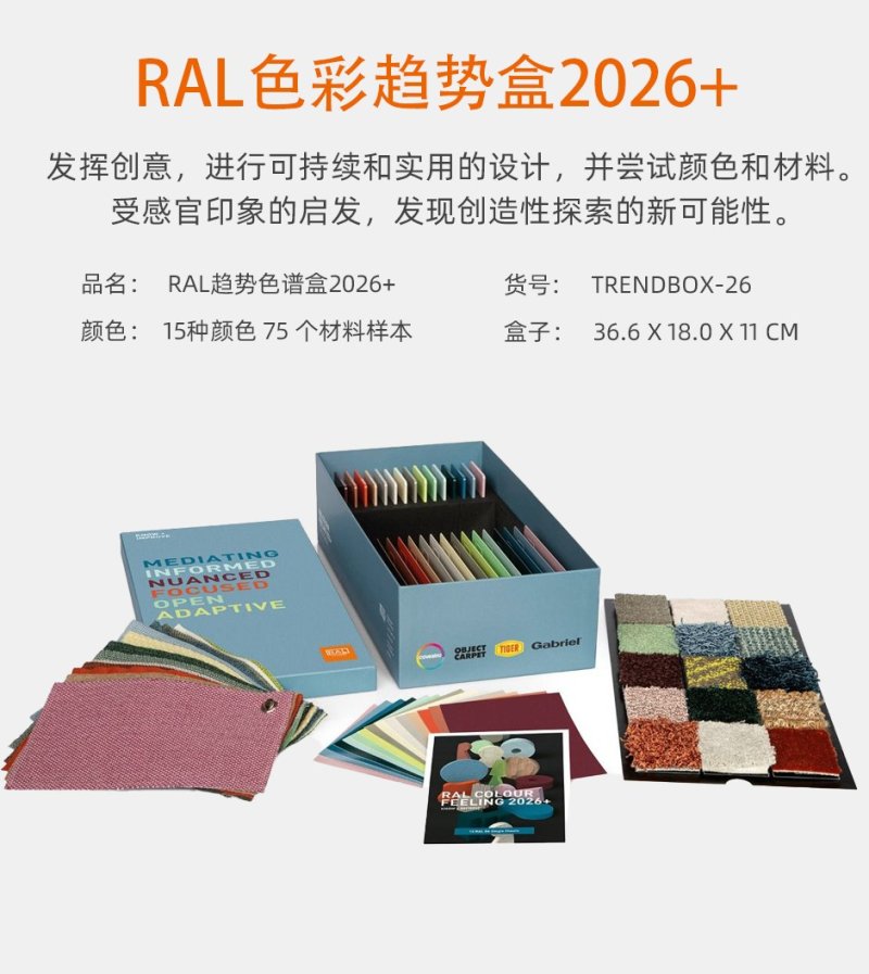 - RAL 趋势盒是一个设计盒,包含趋势报告 RAL COLOR FEELING 2026+ 的所有 15 种颜色,呈现效果色至5 种不同的材料 。